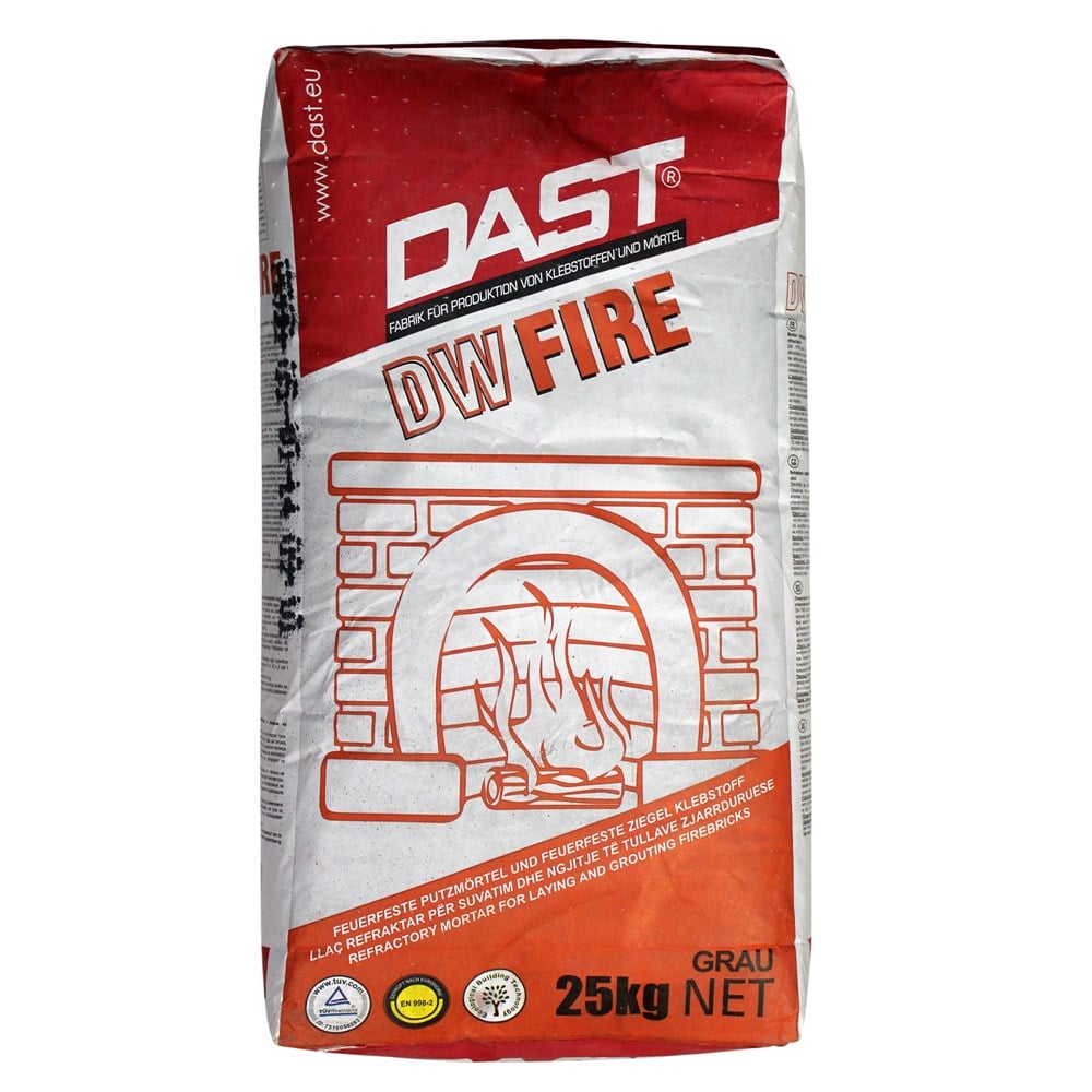 DW Fire is an adhesive for firebricks and tiles. It contains high alumina cement, and quartz aggregates of selected particle size. It provides excellent resistance to high temperatures and extensive temperature changes, high initial and final adhesive strength and resistance to moisture. Suitable for indoor and outdoor applications.Consuption 1.5 kg /m2/mm