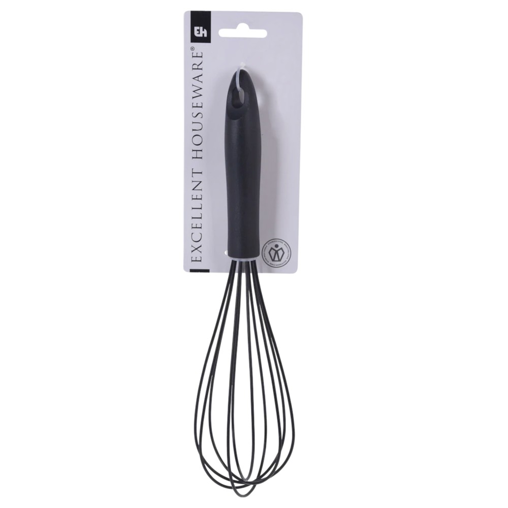 The black polypropylene egg beater, 30 cm long, is a simple and functional tool for mixing eggs and preparing dough in the kitchen. The durable polypropylene material ensures long-lasting use and is easy to clean. The compact design and elegant black color make it a practical and modern tool, suitable for everyday use in any kitchen environment.