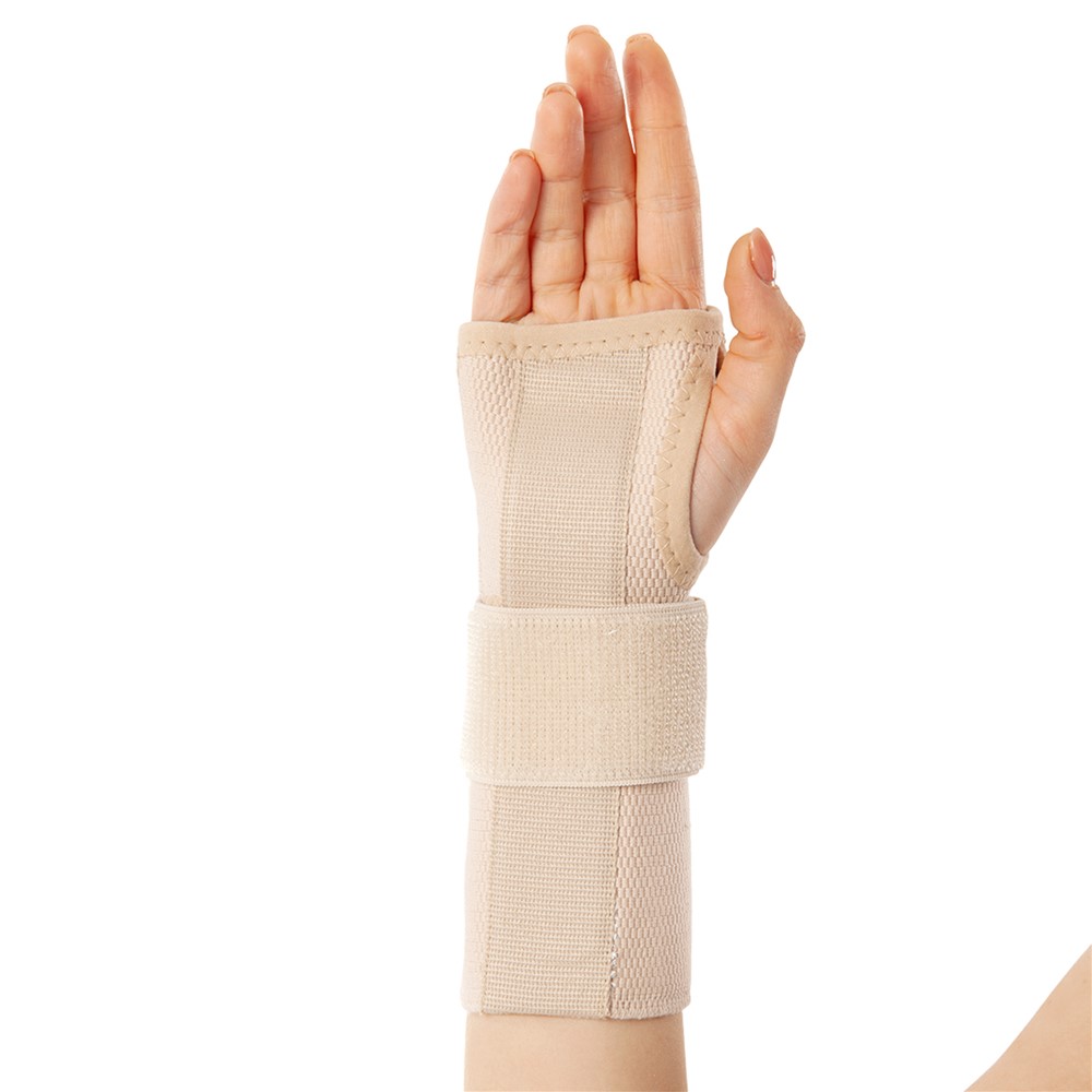 Elastic wrist brace splint, made of elastic fabric reinforced with an aluminum support. It is used to reduce the movement and weight exerted on the wrists, as well as it serves in the treatment of various injuries and traumas, in the treatment of tendon synovitis or for the relief of rheumatic pains in the wrist area. This product is produced separately for the left and right hand.