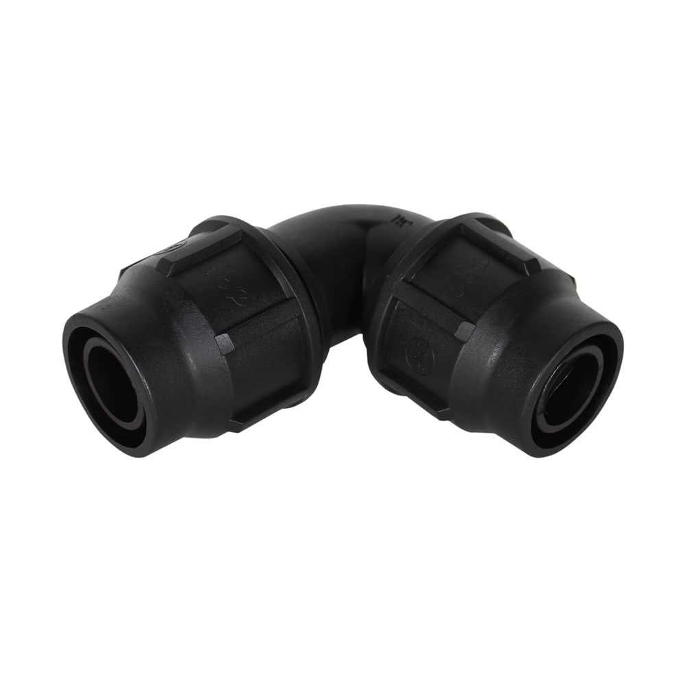 Elbow with faucet of PE 32x32mm with angle 90° used to installations angular water supply infrastructure lines, in irrigation and agricul, etc. The elbow enables network returns 90° angle. Elbow network connects two pipes through coercive mechanical faucet. Manufactured with European standards, resistant to corrosive materials designed to withstand pressure up to 6 Bar.