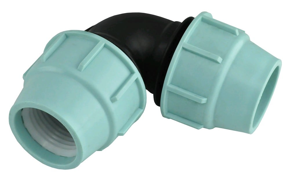 Elbow with faucet of PP 63x63mm with angle 90° used to installations angular water supply infrastructure lines, in irrigation and agricul, etc. The elbow enables network returns 90° angle. Elbow network connects two pipes through coercive mechanical faucet. Manufactured with European standards, resistant to corrosive materials designed to withstand pressure up to 10bar.