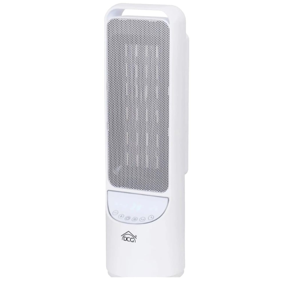 Stove with ceramic heating element; oscillating, with adjustable temperature from 10 to 35°C. Equipped with an anti-tipping safety shutdown system and automatic overheating protection. Equipped with 12 hour timer and remote control. Front safety grille, blue light LED display.