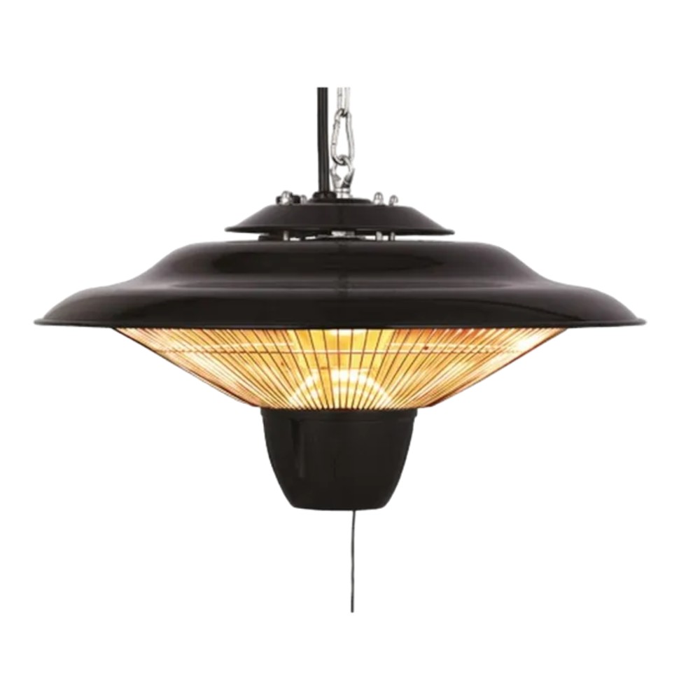 For outdoor use, suitable for immediate limited heating. • Halogen heater 1500W. • Aluminum body, steel protection grille. • Reflector in aluminum. • ON / OFF switch by cord • Support with metal chain. • Power cord. • Degree of protection IP33