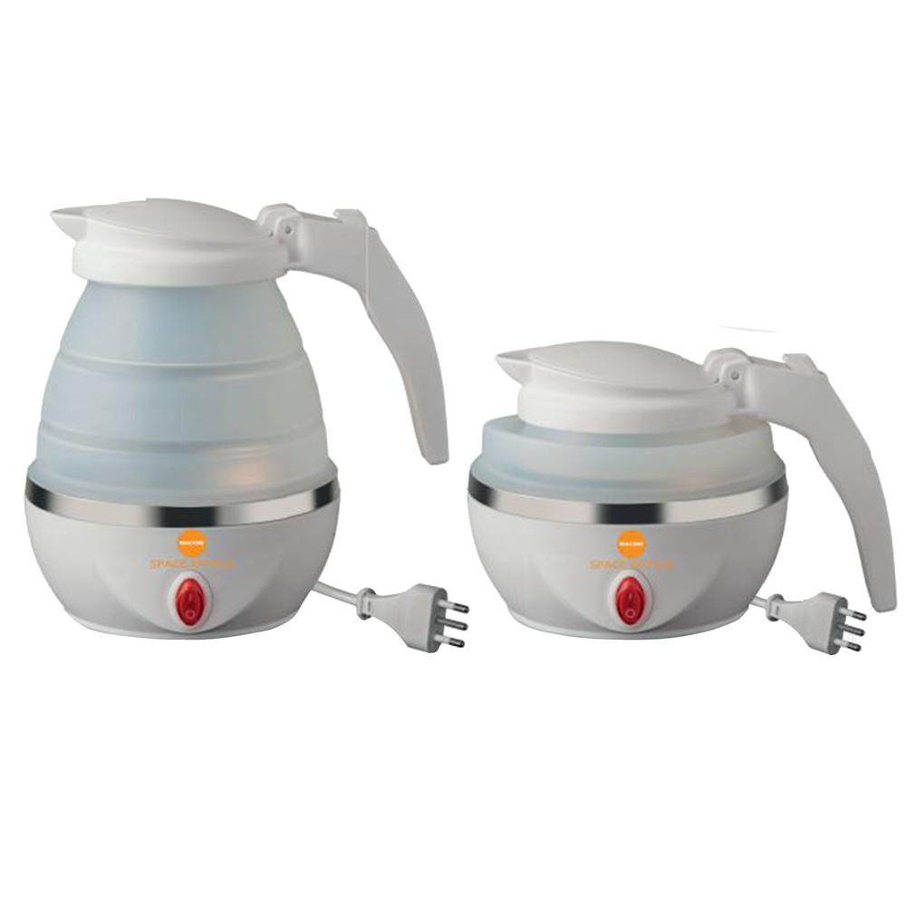 Space-saving folding, electric kettle. Convenient to use at home or during travel. Easy to use: it turns off automatically once the temperature is reached. Ideal to prepare tea, herbal tea, milk and coffee. Capacity 800 ml. Heating element covered by stainless steel body. Handy, ergonomic handle with drip spout.