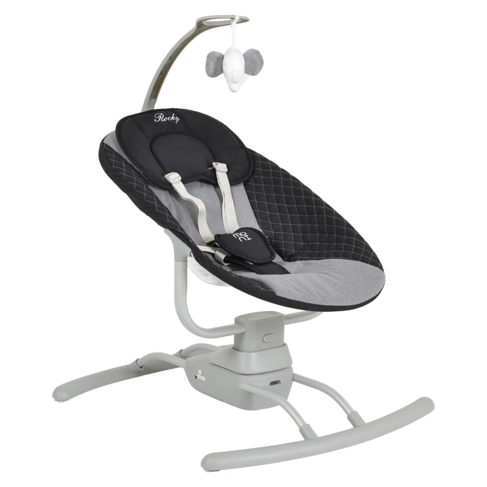 Rocky plastic rocker with aluminum base and anti-allergic textile cover.Electric swing Rocky; Suitable from 0m+ to 9 kg.;Could be used as a bouncer; 3 swing speeds; 5-point harness ensures safety with soft protector; 8 melodies; Can be set to different volumes; Toy bar with 1 soft toy, develops visual perception and entertains the child; Extra soft pillow; High quality textile, removable and washable; Mosquito net; Compact and easily portable; The product could be controlled by button or with a remote control; It works on batteries 4*C (LR14), not included, or with an adaptor, included; Do not use this product when your child is able to sit alone or weighs more than 9 kg