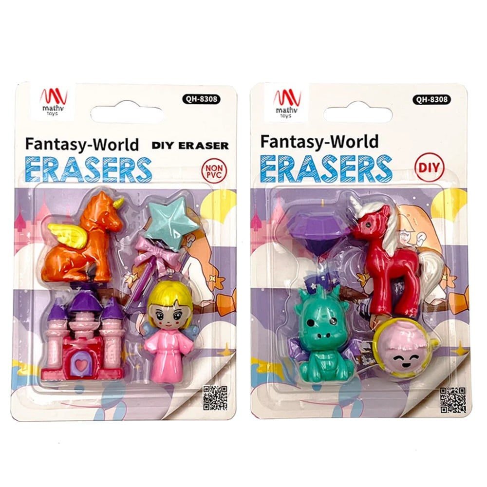 Fantasy World erasers set, mixed colors. This set offers erasers in different designs and colors for erasing notes and mistakes, bringing a fun touch to school supplies.