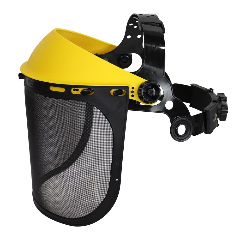 Mesh visor with PP browguard, is suitable for protection against large high-speed particles. The ratchet adjustment system is designed for easy use.