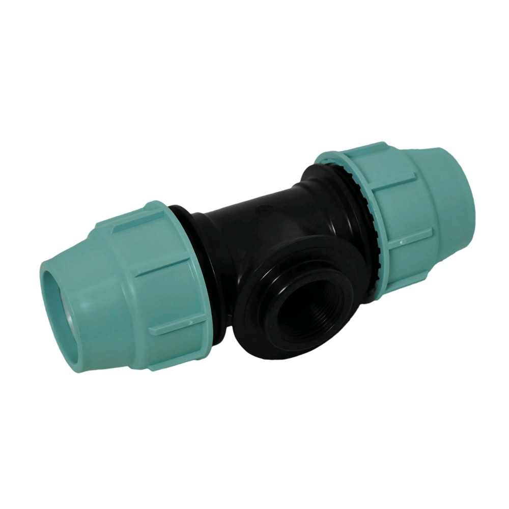 Tee with faucet of PP 50x1-1/4"x50 mm female with angle 90°. Used to installations angular water supply infrastructure lines, in irrigation and agricul, etc. This tee enables network branching 90° angle. This tee connect pipe Ø 50 with other fittings by fillet, for joining the fillet recommend tu use teflon whiles pipe connect whith tee in mechanically with faucet. Manufactured with European standards, resistant to corrosive materials designed to withstand pressure up to 10 Bar.