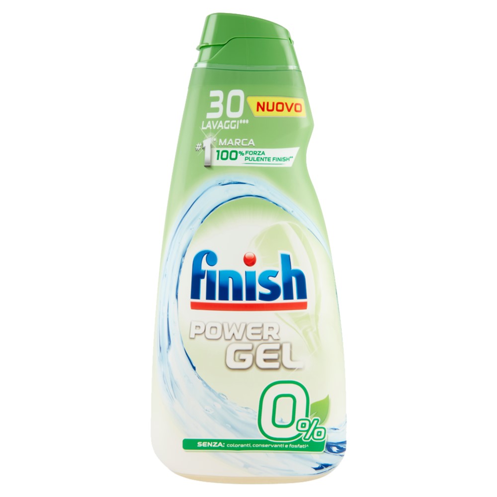Finish liquid dishwasher detergent in gel form power gel 0% 600ml.It dissolves quickly and its power goes into action immediately Finish Power Gel 0% guarantees 100% of the cleaning power Finish but without dyes, preservatives and phosphates.