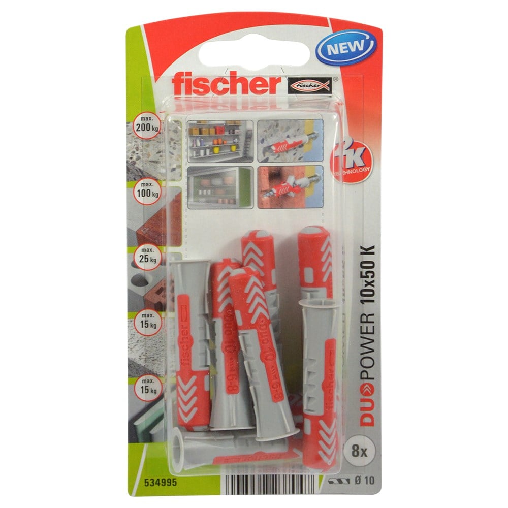 The fischer DUOPOWER offers very good load bearing capacities as a result of the 2 components: The grey component from high quality nylon automatically activates the optimum product function (expansion, folding) for the best hold. The expansion wings of the red component support the secure expansion and provide additional security for the grey component. Simple tightening of the screw and correct "pulling" at the end. No over-tightening of the screw. The edge, formed on the anchor head, prevents the anchor sliding into the drill hole. The DUOPOWER is the first selection for fixing, for example, wall cabinets, wall shelves, mirror cabinets, tool walls, heavy mirrors and wardrobes.
