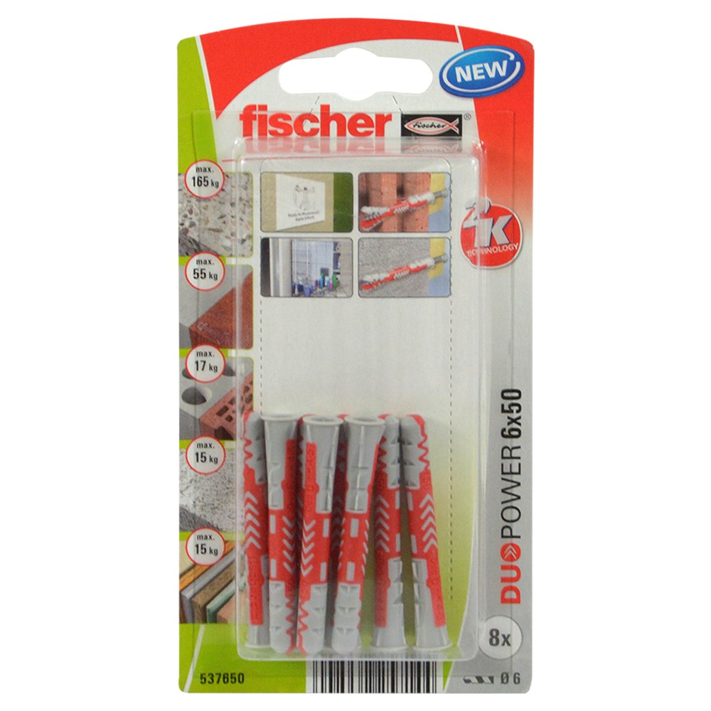 The fischer DUOPOWER offers very good load bearing capacities as a result of the 2 components: The grey component from high quality nylon automatically activates the optimum product function (expansion, folding) for the best hold. The expansion wings of the red component support the secure expansion and provide additional security for the grey component. Simple tightening of the screw and correct "pulling" at the end. No over-tightening of the screw. The edge, formed on the anchor head, prevents the anchor sliding into the drill hole. The DUOPOWER is the first selection for fixing, for example, shower curtain rails, letter boxes, lights, motion detectors, signs and house numbers.