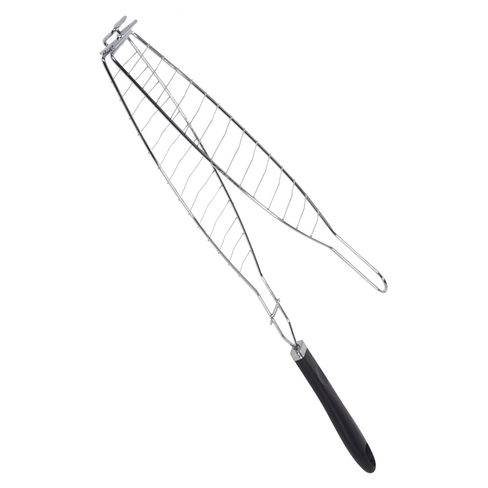 Fish grill for barbecue made of metal material, size 58x11 cm and weight 250 g. The fish grill prevents fragile fish from breaking when rolled over a fire or grill.
