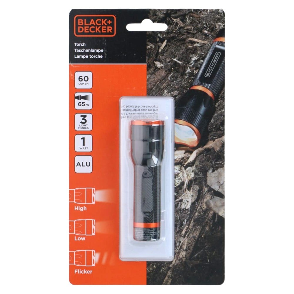 BLACK+DECKER LED Flashlight, the perfect companion for all your adventures! Whether you're camping, hiking or simply looking for a reliable emergency flashlight, this LED flashlight is the ideal choice. With a compact diameter of only 28 mm and a length of 97 mm, the LED flashlight easily fits in your bag or pocket. The aluminum material ensures that the flashlight is lightweight and durable. The BLACK+DECKER LED flashlight runs on one AA battery (not included), making it easy to replace the battery when it runs out. The flashlight uses a powerful XPE LED that produces 1 watt of power, resulting in a bright light output of 60 lumens with a range of 65 meters. You can choose from three different light modes: high, low and pulsating. The highest setting provides maximum brightness, while the lowest setting ensures a longer battery life. The pulsating mode can be used as an emergency signal.
