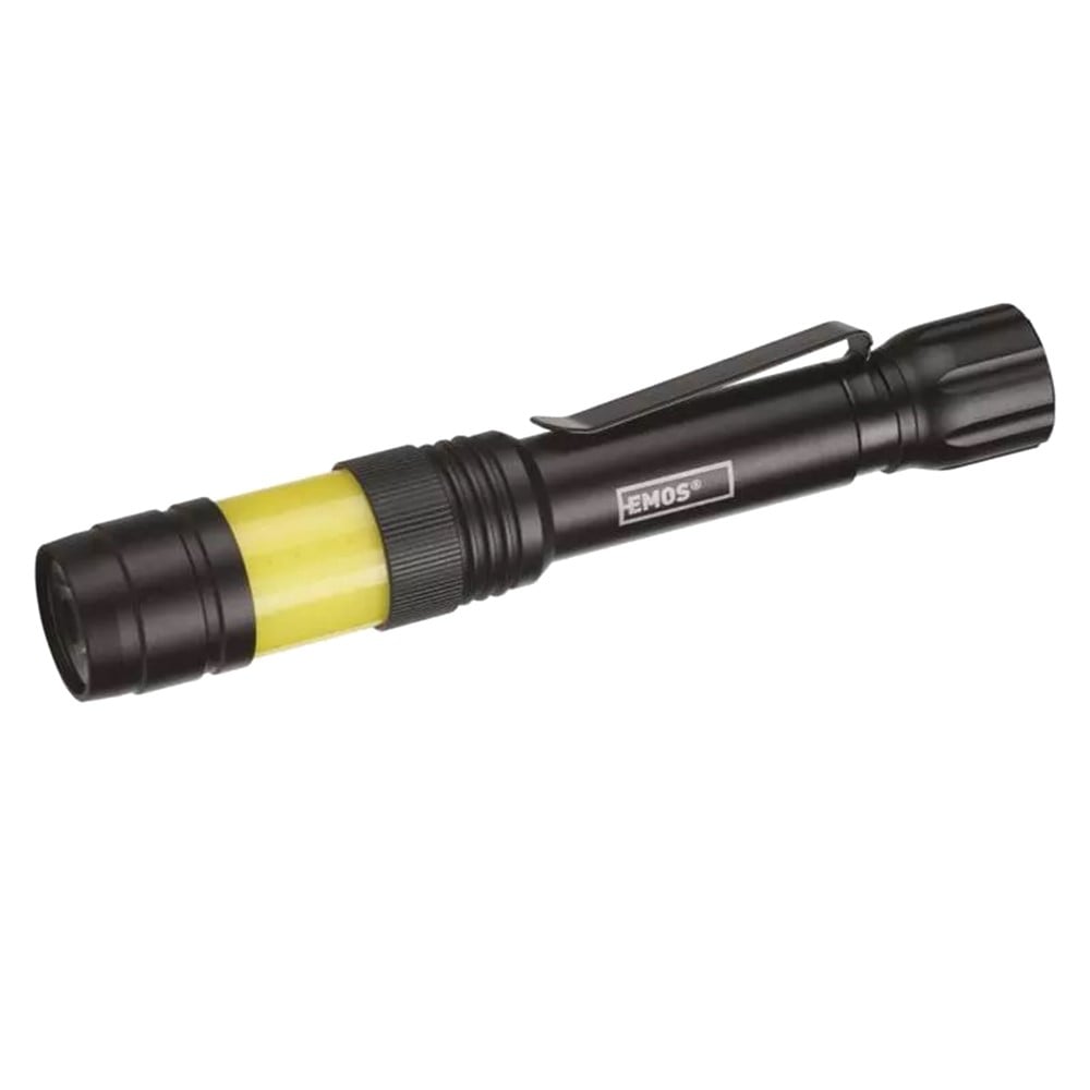 This is a handy LED flashlight from EMOS, which will be perfect for the field. It is made of high quality black aluminum. The flashlight has two LED light sources and a COB LED with a high luminous flux. The product is powered by 2xAA batteries.
