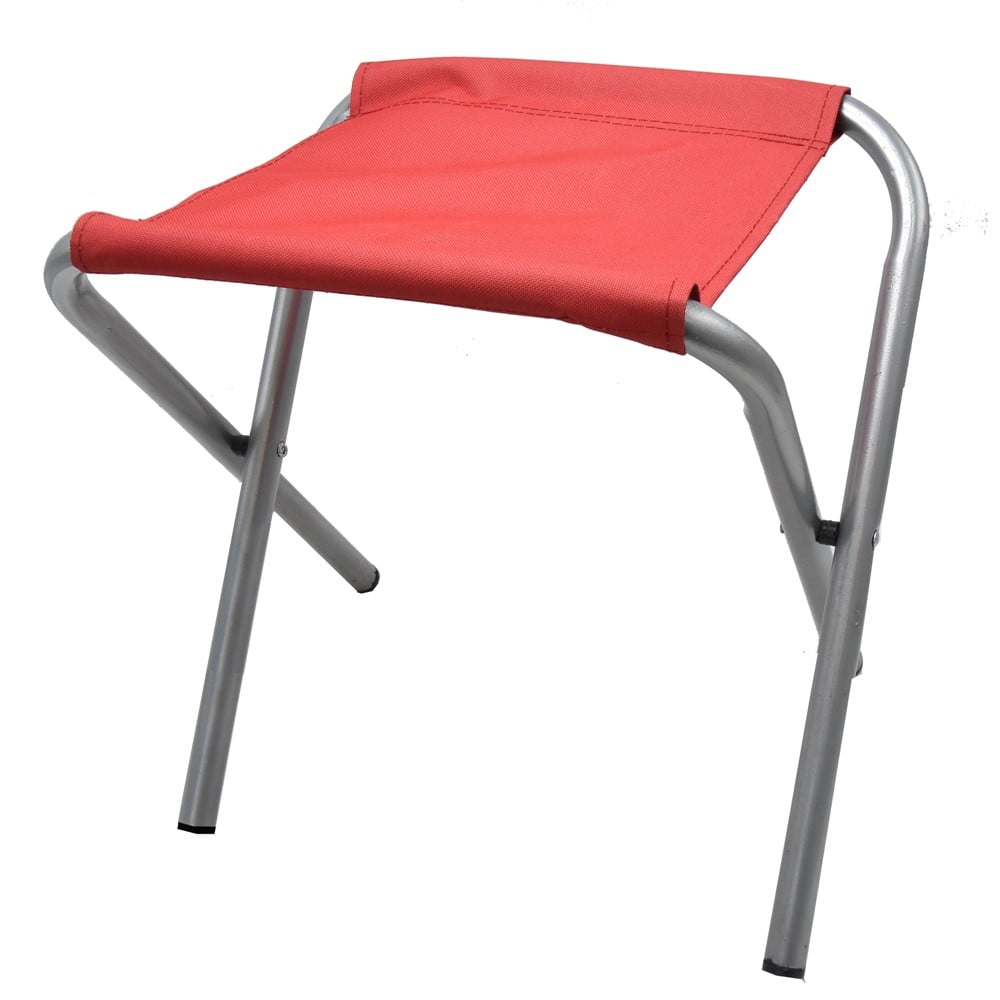 Folding camping stool, with a stable support structure, made of aluminum material, and with upholstery made of textile material. The bench has a seating area of 35x35 cm and a seating height of 40 cm. The metal parts are coated with synthetic epoxy resin material, which is suitable for outdoor environments and protects against rust or blackening. It can be used on camping trips, picnics or on the beach and can be easily transported thanks to its compact dimensions.
