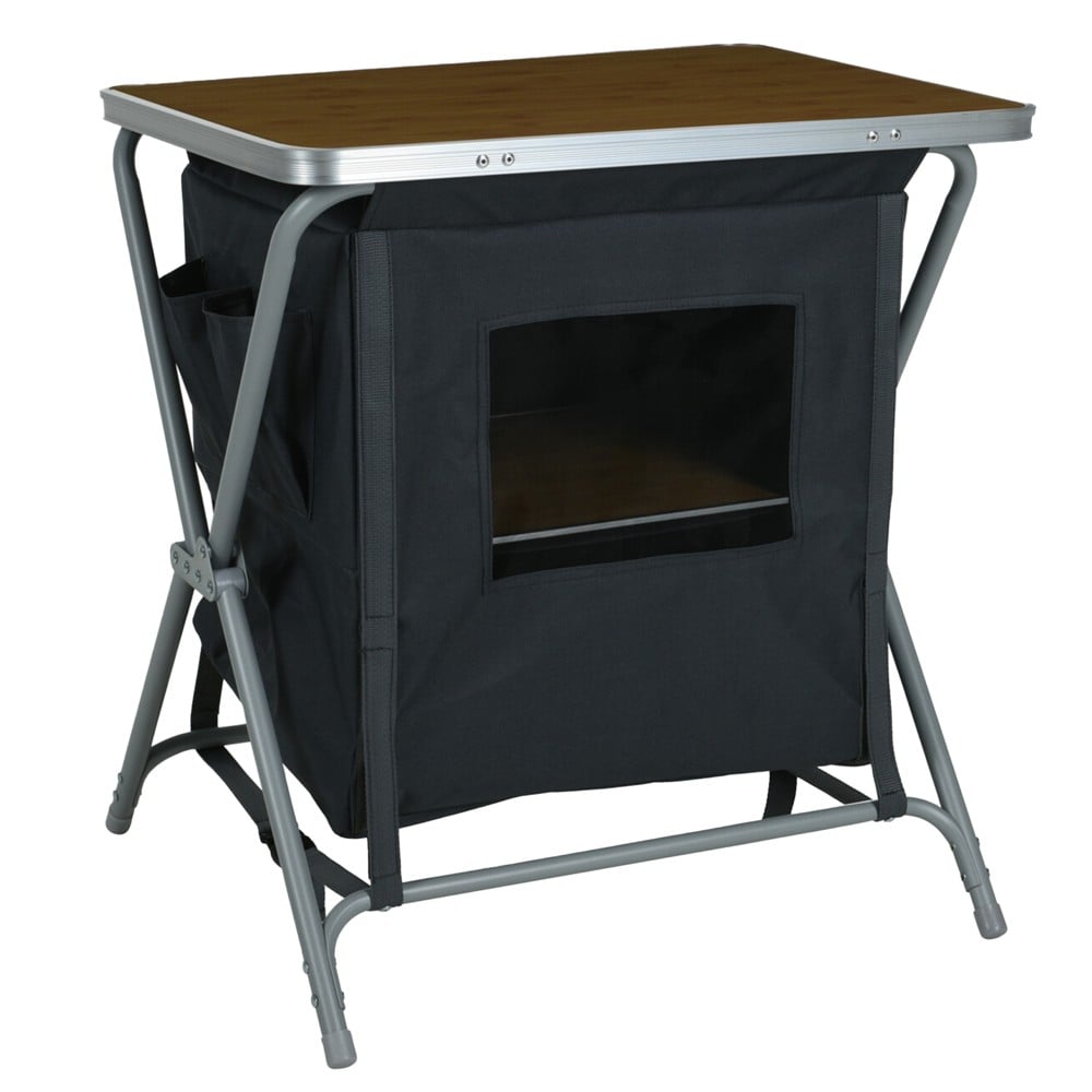 A multifunctional camping cabinet. The camping cabinet offers a large number of functions. The practical shelves provide enough storage space for other camping needs. The cabinet also functions as a table where you can enjoy your meal. The quality kitchen shelf tall and foldable with its many shelves offers enough storage space for a comfortable camping stay. The aluminum tube shelf can be folded to save space and is therefore easy to store. the top is made of PVC and has a wipe coating. The other 2 shelves are in a polyester cabinet protected with mesh fabric on the back for good ventilation. The cabinet can be easily zipped and the "door" can be easily rolled away and secure if desired.High quality shelf or cupboard provides enough storage space for a longer camping stay.Cover (100% polyester) is very durable. The storage compartments can be opened with an integrated zipper, so that even larger objects can be stored.