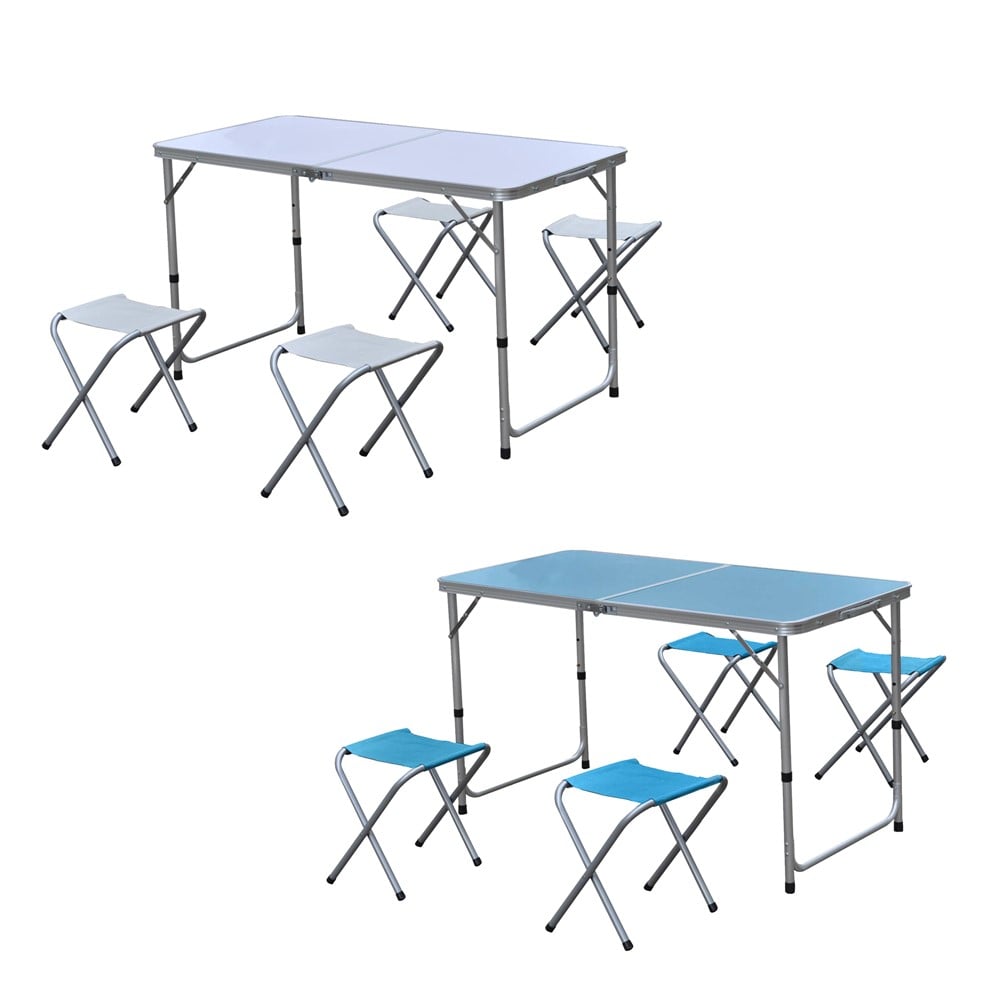 Folding table with 4 benches, made of aluminum base material, MDF layer material, and polyester material of the bench seat. Its lightweight aluminum material makes it easy to carry, its carrying capacity is 30 kg The camping table consists of folding table with open dimensions 120 cm long, 70 cm high and 62 cm wide, The chair in size 30 cm long, 36 cm high and 24 cm wide. Color: white and gray. Suitable for use in the kitchen, in the yard or during a picnic or camping, suitable as a side table on a terrace.