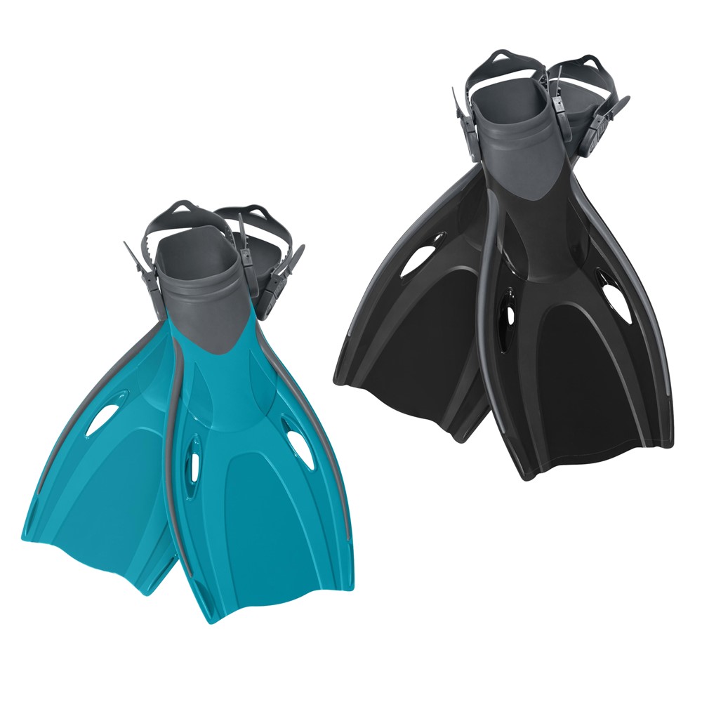 Diving fins, size 5.5-8 according to the American standard and 37.5-41 according to the European standard, with a structure composed of plastic material and soft silicone material without latex content, with dimensions of 54x22x14 cm, in different colors. The constituent material allows the fins to easily match the shape and size of the foot. The flexible structure of the diving fins allows more speed during swimming and diving. The fins are equipped with a rubber layer on the bottom part, which prevents slipping while walking on land. The package also contains a bag for storing and transporting the shovels.
