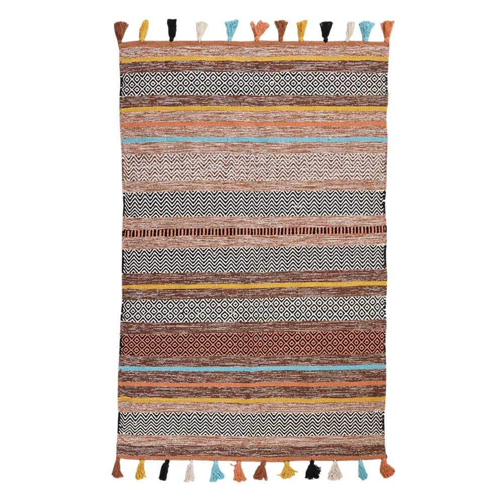This carpet with tassels, masterfully crafted from chenille and cotton, is a vibrant and warm addition to any space. With its diverse colors, it brings a sense of joy and dynamism, making any environment more inviting. The soft texture of chenille and the natural feel of cotton combine to create a pleasant sensation underfoot, offering comfort and a touch of luxury. The added tassels at the edges of the carpet give it a unique character and an eye-catching look, making it a focal point in your decor.