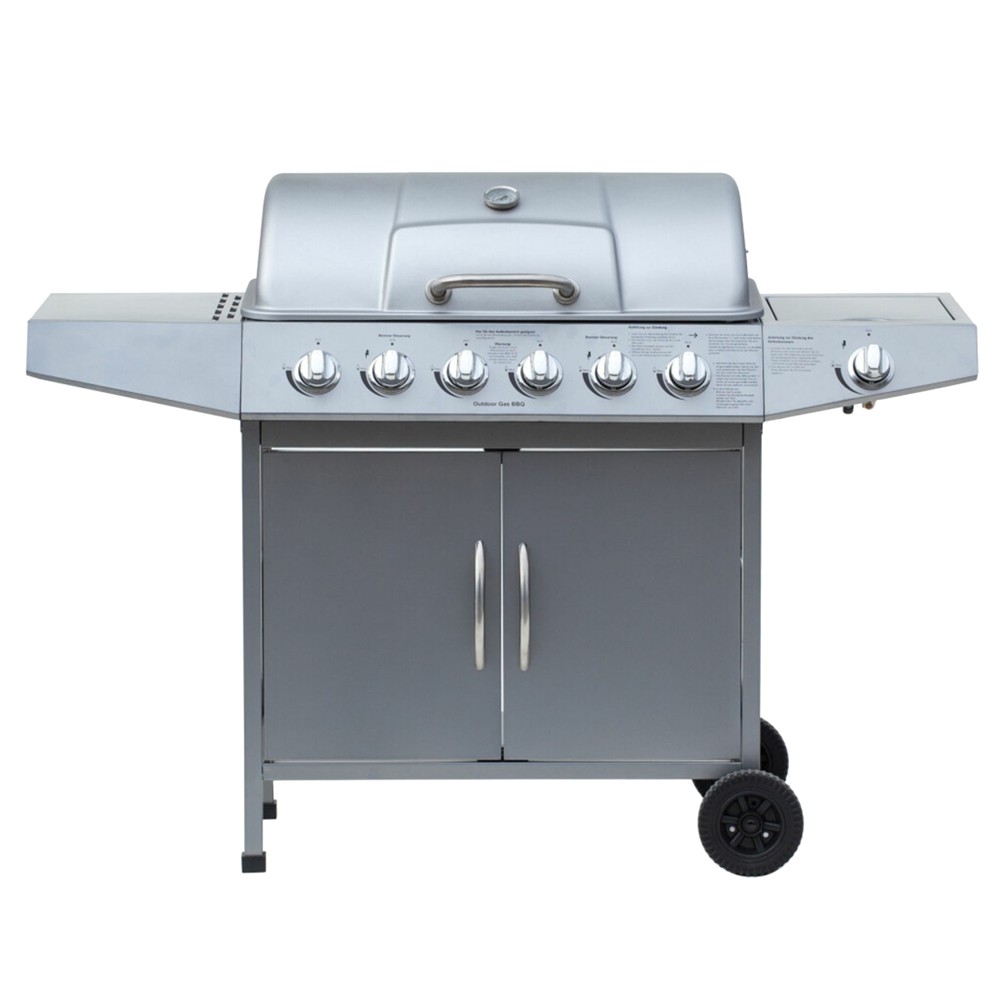 Gas barbecue, Dytron, in silver color, size 133x97x54 cm, with 6+1 hearths made of metal material which is easy to clean. Equipped with a lid, side wheels that make it easier to transport, with a side holder and a multi-functional holder shelf that helps to hold cooking accessories as well as 6 hotplates and 1 side cooking water. Simple design and high quality make this barbecue ideal for any cooking.