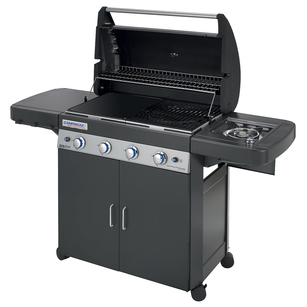 Gas barbecue, made of durable stainless steel material, with enamelled cooking surface, which does not stick and is easy to clean. The barbecue is equipped with 3 main burners, for roasting meat, fish and vegetables, as well as a side burner, which is used mainly for the preparation of sauces. It works with the Dual Gas system (Methane / LPG), which allows for a quick preparation of various foods. The barbecue has a side table and is equipped with 4 wheels, which facilitate movement. InstaClean™ integrated cleaning system facilitates cleaning after use.