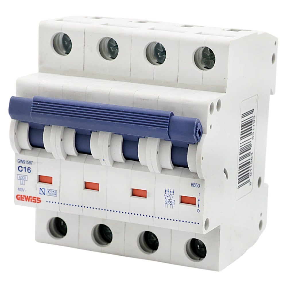GEWISS magneto-thermal circuit breaker, 4 modules, C, 16A, 6kA. This circuit breaker provides efficient protection against overloads and magnetic discharges, preventing damage to the electrical system. With a capacity of 16A and a breaking capacity of 6kA, it is suitable for use in medium and small systems, such as homes, offices and commercial environments. The 4-module design makes it suitable for electrical panels that require more space, providing reliable and durable protection for electrical equipment.