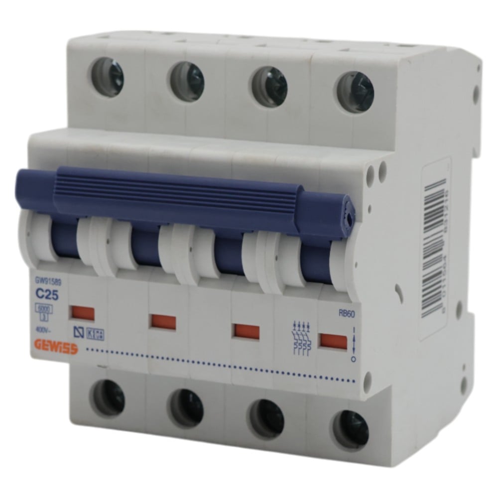 GEWISS magneto-thermal circuit breaker, 4 modules, C, 25A, 6kA. This circuit breaker offers advanced protection against overloads and magnetic discharges, preventing damage to electrical systems and connected equipment. With a capacity of 25A and a breaking capacity of 6kA, it is suitable for use in commercial, industrial and domestic installations with medium to high power requirements. The 4-module design makes it suitable for larger electrical panels and provides reliable and efficient protection for your electrical system.