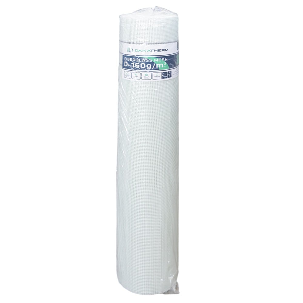 DakaTherm Fiberglass Mesh is a versatile material commonly used in construction for reinforcing cement, plaster, and other building materials. It is made from thin strands of fiberglass that are woven together to form a flexible and strong fabric. This fiberglass mesh has been plasticized and treated to be resistant to alkalis. It is used in thermal insulation systems for facades to reinforce base plasters during renovations and in leveling and waterproofing materials. It is usually sufficient to use a single layer of this armor for higher temperature resistance and to withstand other loads. However, for lasting impact resistance, it is recommended to use a double layer of armor.