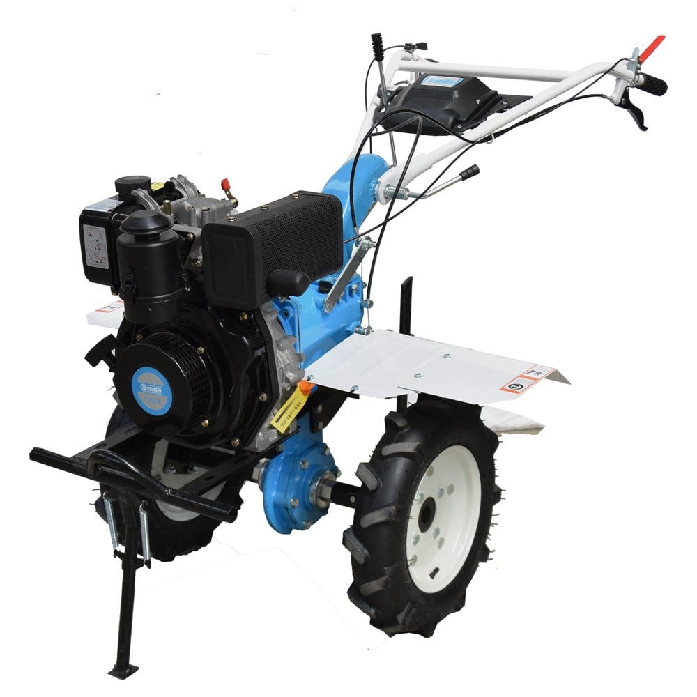 Diesel tiller 296 CC (4-stroke diesel) 3600 RPM. Front-Tine, Dual-Direction Gas Tiller is self-propelled and can travel forward (2 gears) and in reverse (1 gear) for ease of use. It is equipped with reinforced steel tines to help ensure efficient tilling. The tiller comes with a pull-cord start-up mechanism for dependable operation. Equipped whith pre-istalled wheel for easy transportation. With a working width of 1000-1050mm and working depth of 150mm.