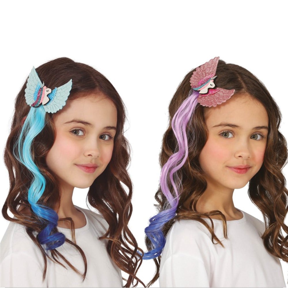 Hair strands, hair accessory with Unicron, made of synthetic material, in a unique Unicron color. Suitable for use by children, Unicorn fans. Usage: grab this lock of colored hair in your hair with the clip under the winged unicorn.