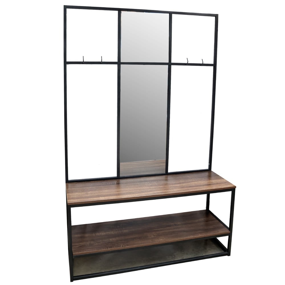 Hall unit, Facto, metal, with mirror and 3 hooks, oak/black, 120x40xH190 cm