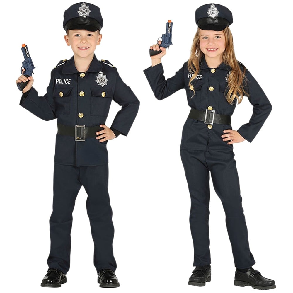 Police costume for children, made of polyester material, mixed color. The component material is soft to the touch and does not cause skin irritation. This product is suitable for use by children aged 7-9 years with a height of 125 cm to 135 cm, bust 67-70 cm, waist 59-60 cm, hips 67-72 cm.