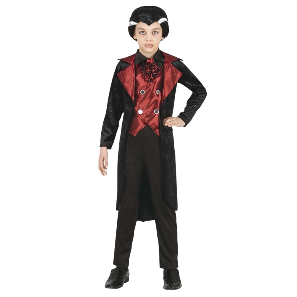 Vampire costume for children, made of polyester material, mixed color. The component material is soft to the touch and does not cause skin irritation. This product is suitable for use by children aged 5-6 years with a height of 110 cm to 115 cm, bust 59-62 cm, waist 55-57 cm, hips 62-64 cm.
