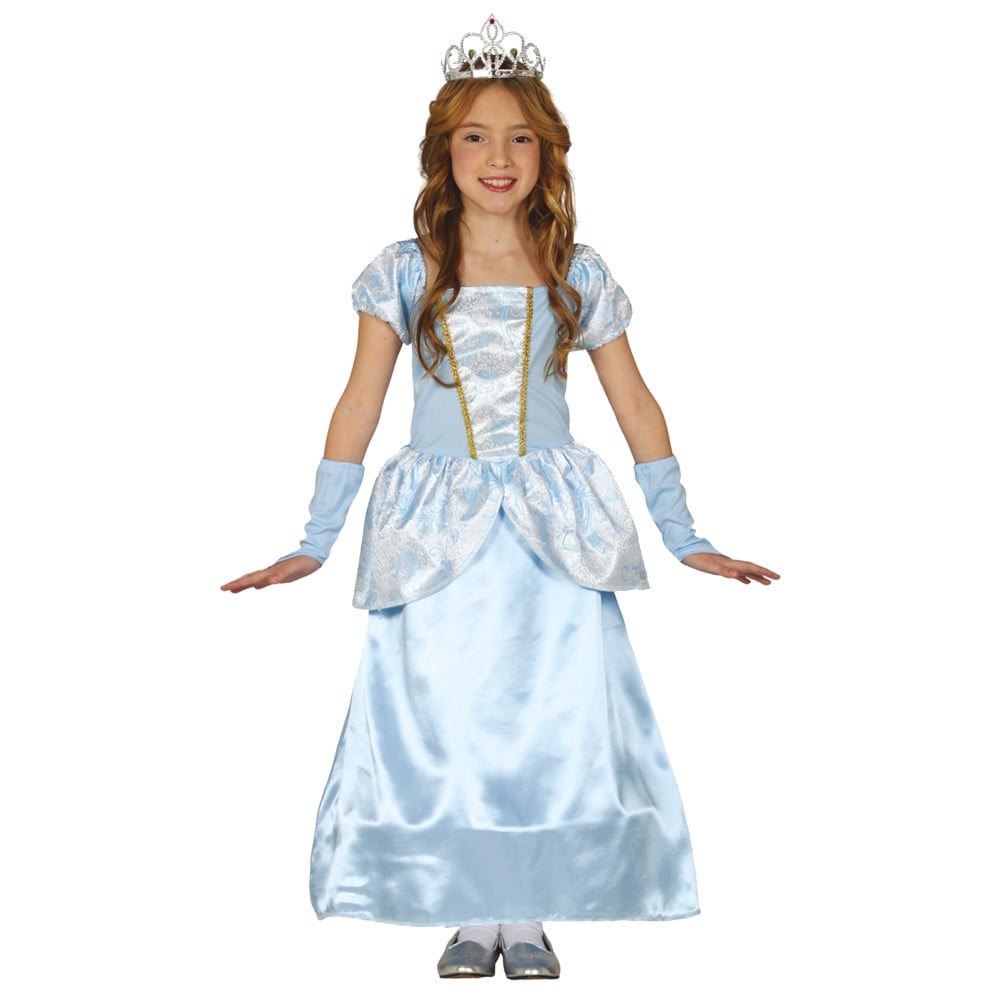 Blue princess costume for children, made of polyester material, in blue color. The component material is soft to the touch and does not cause skin irritation. This product is suitable for use by children aged 7-9 years with a height of 125 cm to 135 cm.