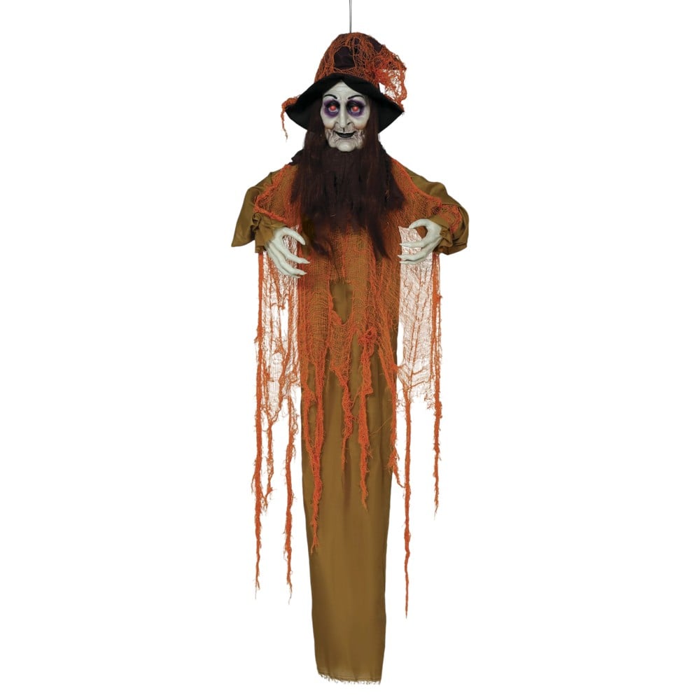 This Halloween decoration designed as a witch is a fantastic accessory for your party. With a length of 180 cm, it comes with lights, sound and movement, creating a scary and fun atmosphere. Suitable for hanging in doors, walls or ceilings, this decoration will attract everyone's attention and give a magical touch to your environment, an ideal choice to make any Halloween party unforgettable.