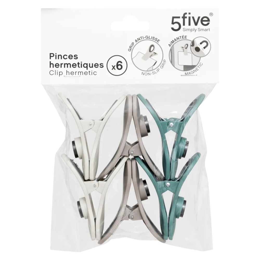 Hermetic clip with magnet produced by 5FIVE Simply Smart in polypropylene material and variable colors. The package includes 6 pieces. This product is ideal for sealing bags as well as magnetic hanging in the fridge for quick access.