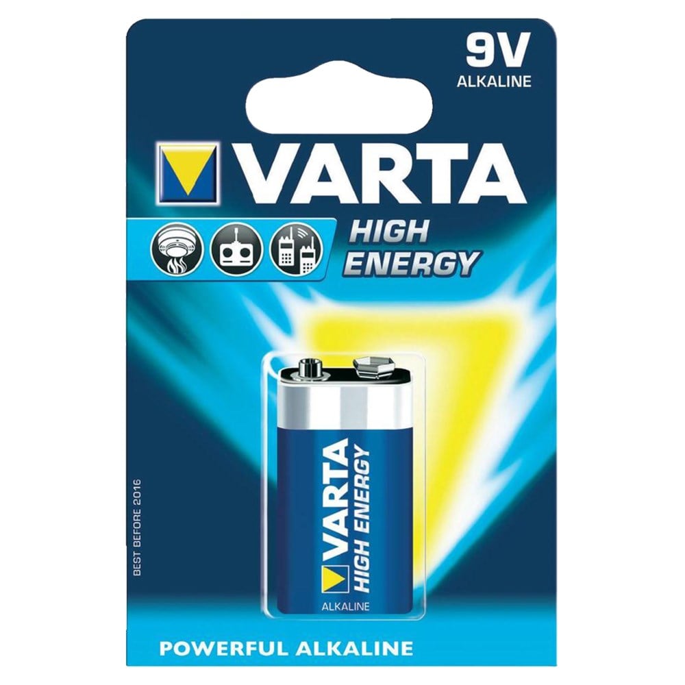 Alkaline battery 9V model. Dry alakaline Batteries have a 1.5V working voltage and have a longer life than simple batteries, about 20% more. Also alkaline batteries have a greater energy density.