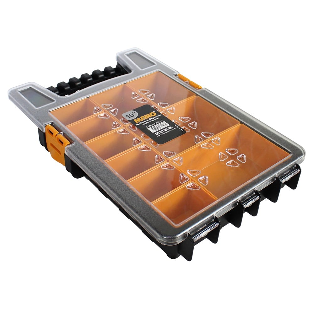 This 10-Compartment Small Parts Storage Organizer features deep, adjustable compartments that are great for organizing small parts and tools.It is easy to carry with you. This plastic storage case has 2 locking tabs , so parts stay in place. Plastic construction for durable, rust-resistant small parts organizing 6 adjustable compartments for versatile storage Built-in handle for easy carrying 2 locking mechanisms help prevent spills Includes additional dividers for convenienc