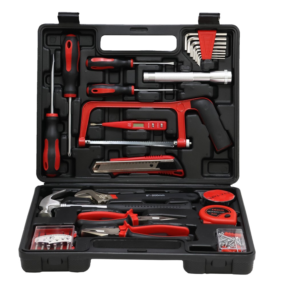 The perfect set for performing daily tasks in your home. The set includes 4 screwdrivers, 1 knife, a mini set with 8 hex keys, 1 indicator, 1 saw, 1 8" spanner, 1 PVC insulator, 1 hammer, 1 meter, 2 pliers, 6 precision heads, 2 saw blades and tool storage box.