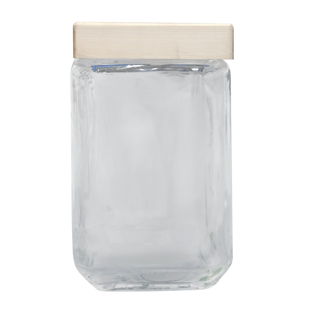 Transparent glass design allows viewing of the interior content of the jar, making it easy to identify stored products. The wooden lid provides a safe and durable closure to maintain the freshness and quality of the food stored inside.