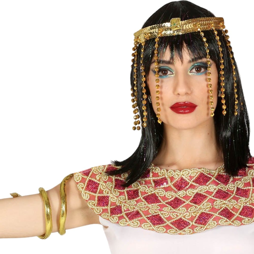 This Cleopatra-inspired jewelry set features an elegant crown and a beautiful bracelet, both in gold. Refined design and subtle details give this set a regal look, perfect for parties, special events or as an accessory to themed costumes. Made of high-quality materials, this jewelry will help you make an unforgettable impression.