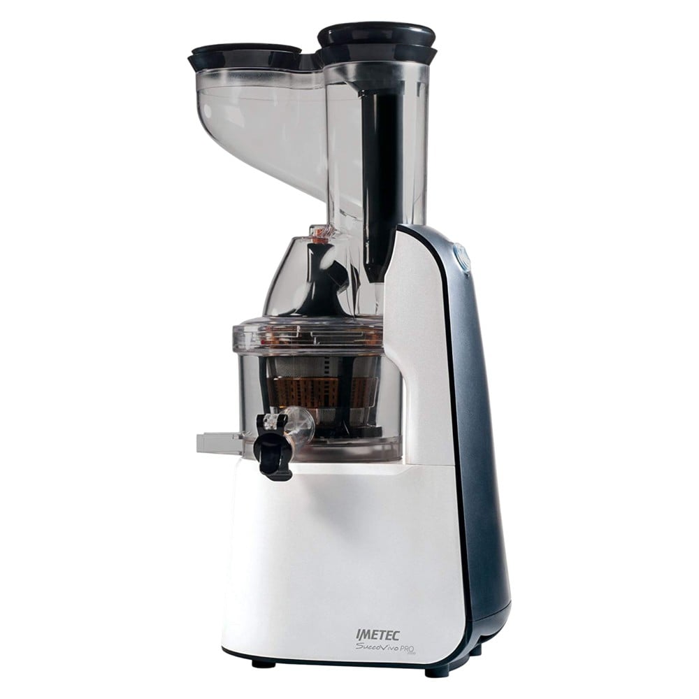 IMETEC SUCCOVIVO PRO 2000 is the professional juice extractor* with slow squeezing at 48 rpm to prepare natural juices rich in vitamins, vegetable milk for intolerant people, tasty sauces, cold cream soups, ice creams and fresh granitas . SuccoVivo is also a beauty ally because with the exclusive Beauty filter and recipe book included, you can transform the residual pulp of fruit and vegetables into completely natural beauty masks. IMETEC PRO technology guarantees professional performance: it maintains 100% of the vitamins** of fruit and vegetables with cold pressing; the ultra-resistant auger with diamond tips in ULTEM™*** optimizes the extraction of juice and nutrients, with minimal waste; the professional induction motor with steel gears, 300W, easily squeezes even the most difficult foods such as pomegranates, artichokes and dried fruit and also allows you to make granitas. The double mouth is very convenient because you can insert more foods at the same time: in the wide 75 mm one, whole fruit and vegetables or large pieces, such as apples, oranges or tomatoes; in the 45 mm one, smaller and thinner foods such as celery or carrots.