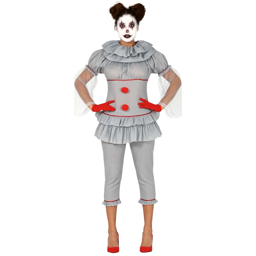 Killer clown themed suit made of polyester material consisting of 3 parts, 1 gray pants, 2 collared collars and bust blouses with butterflies. Sizes S 34-36. Ideal for use on holidays, birthdays, Halloween with Killer clown theme.