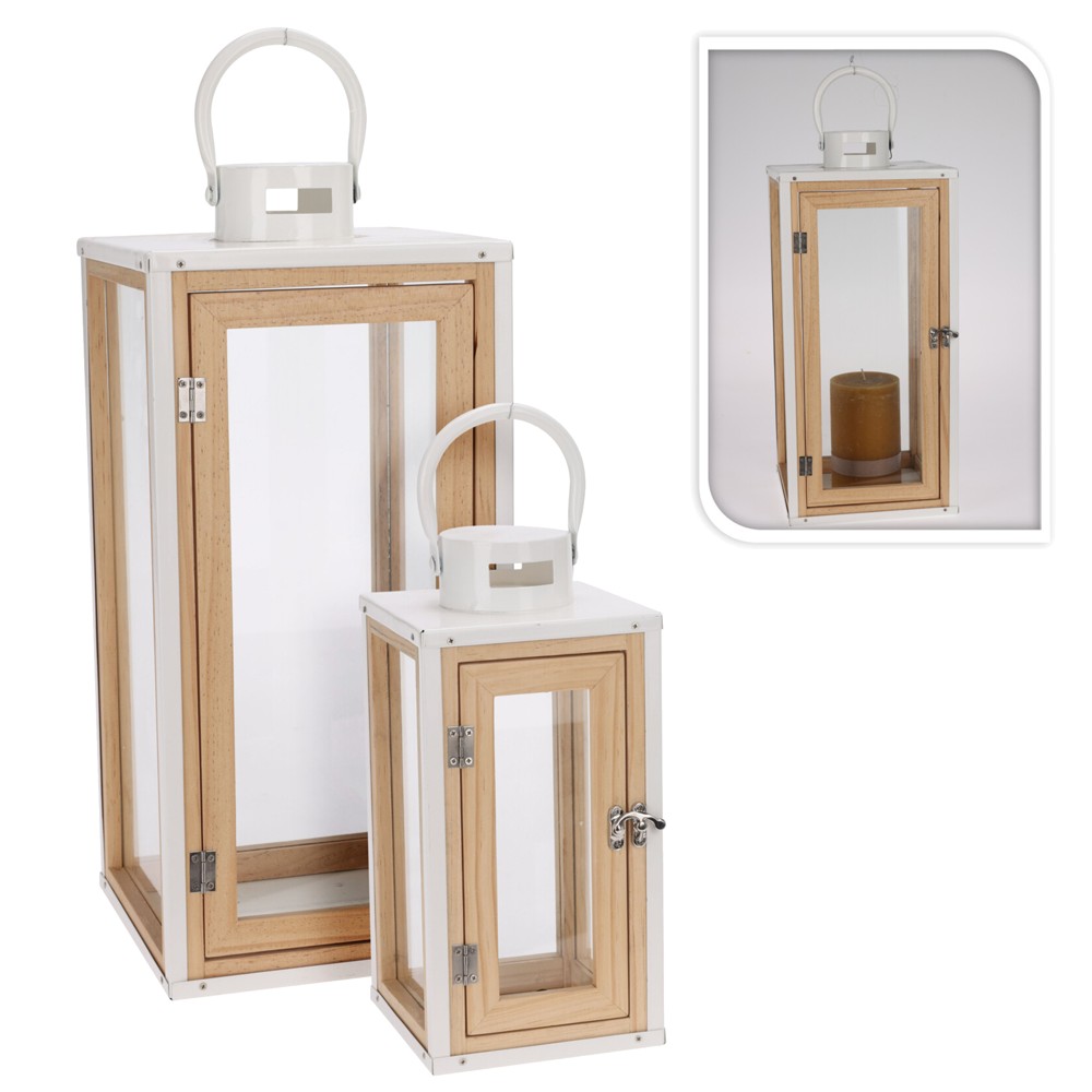 Lantern, 2 pieces, glass/wooden, white/natural, 14.5x14.5xH30.5 cm; 20x20xH45.5 cm