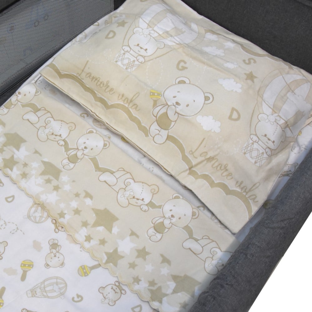 The set of linen for children Made of 100% cotton material makes this set incomparable and ideal for gifts or daily use. The set includes 3 parts: the bottom sheet 65x130cm, the top sheet 120x180cm and the pillow case 40x60 cm, beige color with bears.