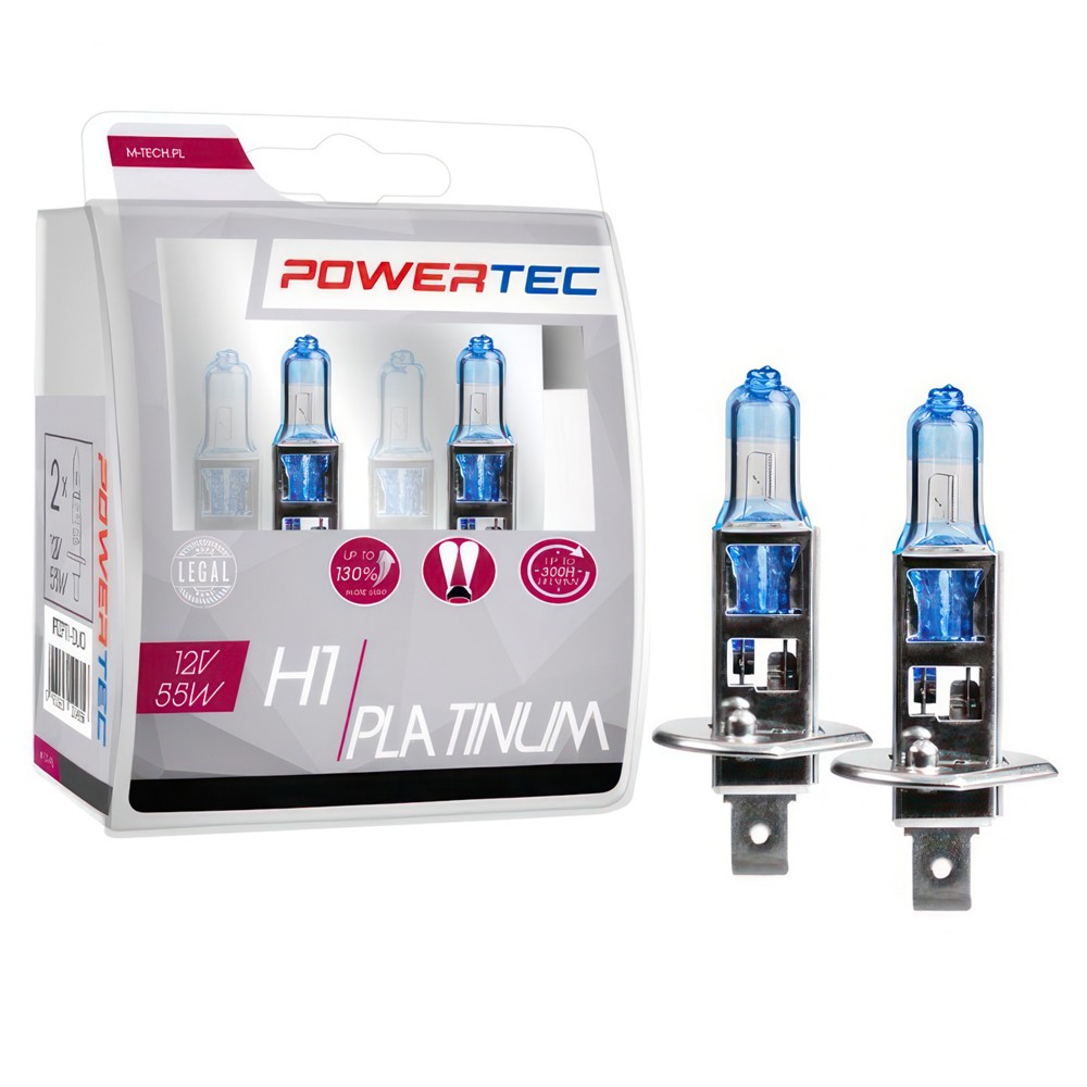 PowerTec 12V 55W H1 Platinium Halogen Bulb PowerTec Platinium has 130% better light output compared to other standard halogen bulbs. A specific construction of the bulb with appropriate filters, based on top components, assures a strong, far-reaching and snow-white light. A hallmark of the Platinium bulbs is the same colour temperature (measured in Kelvin) as in any other branded products, with only 5% less luminous flux (lumen). The snow white color is less tiring for eyesight of the driver. The longer light beam is a guarantee of faster obstacle recognition, better visibility and overall safety on the road. A high quality product, shockproof, with long lifespan, resistant to temperature variations, made of tempered quartz glass with UV filter which protects the bulb form taking damage and a stainless steel base. Properties: Perfectly tuned focal length, Solid filament, Noble gas blend, UV filter, Tempered quartz glass, Stainless steel base, Elegant DUO packaging. Replacement for: Osram Night Breaker Unlimited Philips Extreme Vision Specifications: Mark: H1 Base: P14,5s Homologation: E4 Power: 55W Voltage: 12V Symbol: PTZPT1-DUO 130% more light.