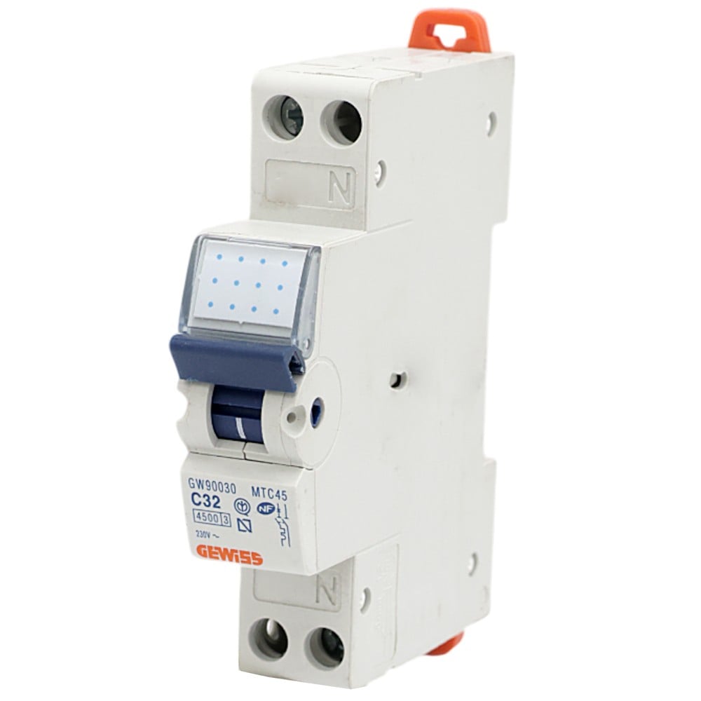 GEWISS magneto-thermal circuit breaker, 1P+N, 1 module, C, 32A, 4.5kA. This circuit breaker provides efficient protection for installations using one phase and one neutral (1P+N). With a capacity of 32A and a breaking capacity of 4.5kA, it is ideal for use in domestic, commercial and other installations with medium to high loads. The compact 1 module design makes it suitable for smaller electrical panels, offering reliable protection against overloads and magnetic discharges, ensuring safe and stable operation for your electrical system.