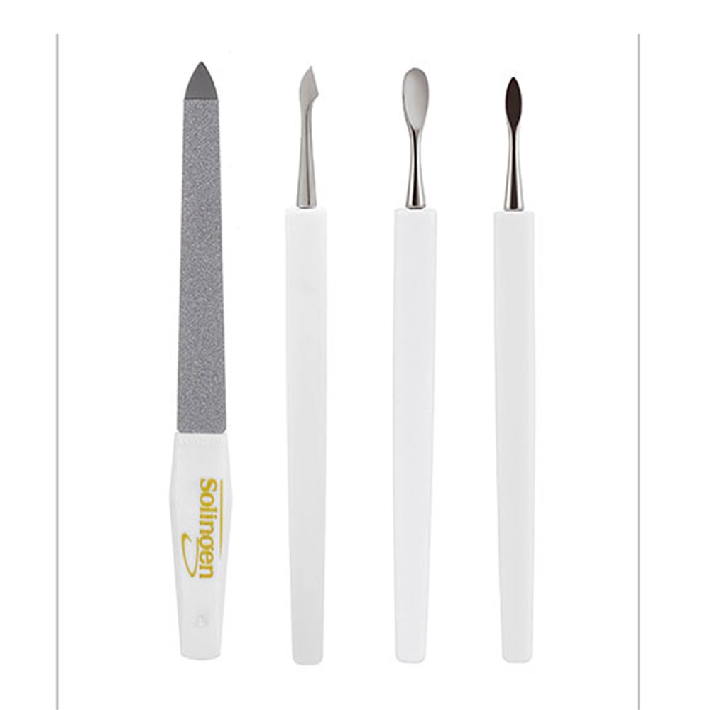 Manicure set "Miniso Solingen", with 4 nail care tools, made of nickel-plated and chrome-plated steel material and polystyrene handle, in white color. It can be used for filing of nails, pushing back cuticles, cutting of pushed-back cuticles and cleaning of nails.
