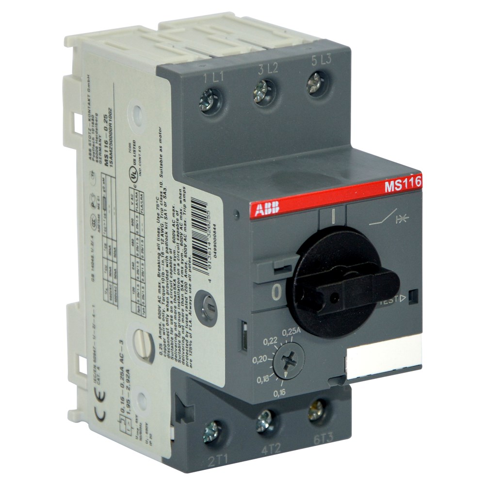 The MS116-0.25 manual motor starter is a compact 45 mm width devices with a rated operational current of Ie = 0.25 A. This device is used to manually switch on and off motors and to protect them reliably and without the need for a fuse from short-circuits