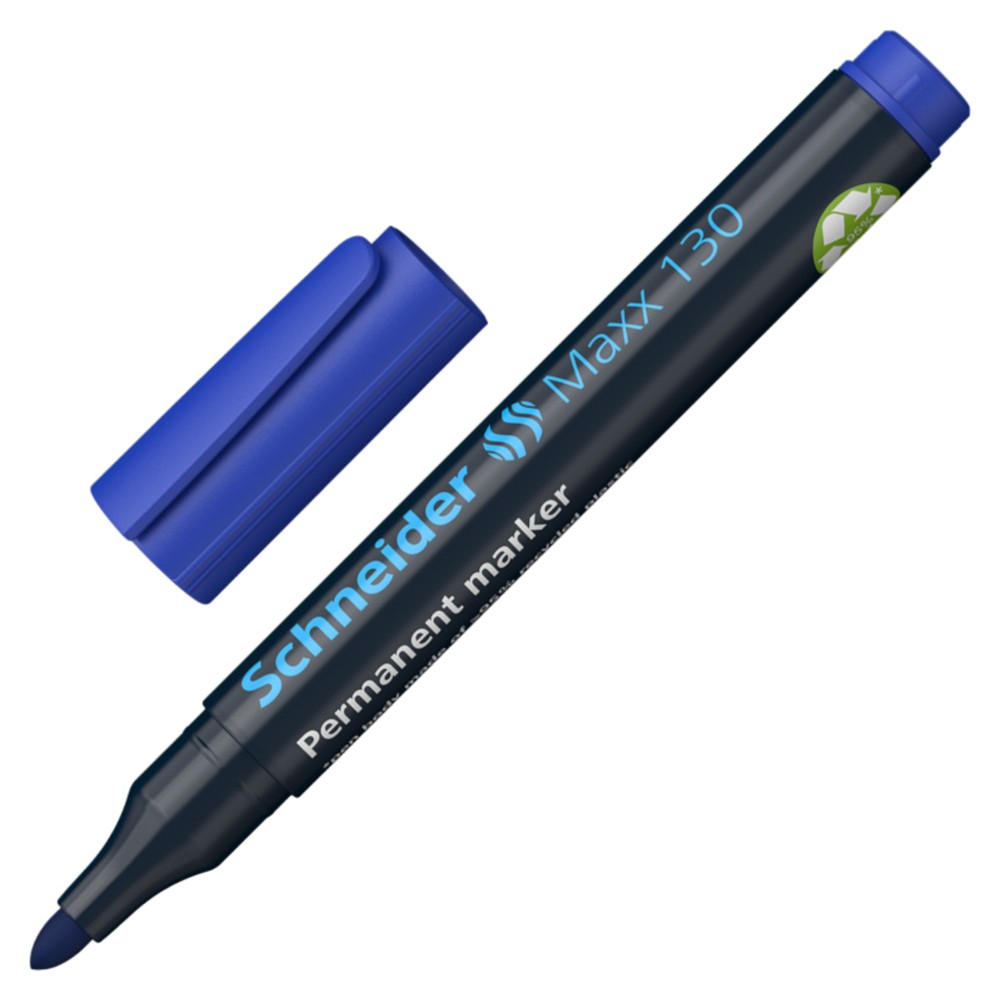 Permanent marker, line width 1-3 mm. Font color blue. Its body is made of 95% recycled plastic, the internal ink tank is made of 75% recycled fibres. For writing on cardboard, paper, plastic, glass, metal, wood and almost all other materials. The writing is quick drying, waterproof and very light resistant. Capped paint does not dry even if the cap is removed for 2-3 days. It has a low odor and does not contain toluene and xylol.